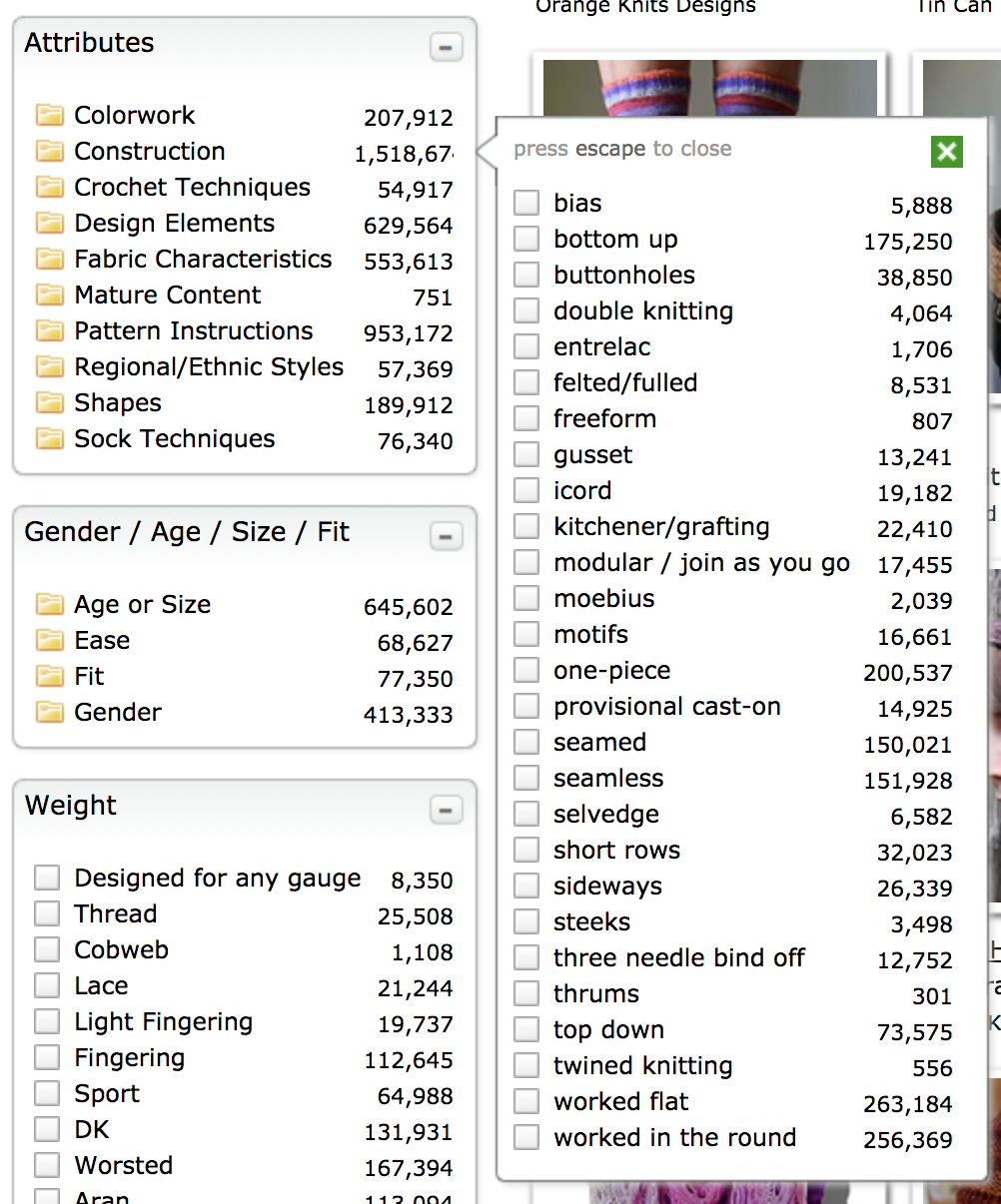 Construction’s subheadings (bias, bottom up, etc.) are highly specific terms that describe particular strategies of form in knitting and crochet projects. A novice user would likely not find “entrelac” a useful term, because it is a construction technique they are unlikely to be familiar with, nor would they find the resources particularly accessible once selected, as entrelac is a textural knitting technique with relatively complex architecture.